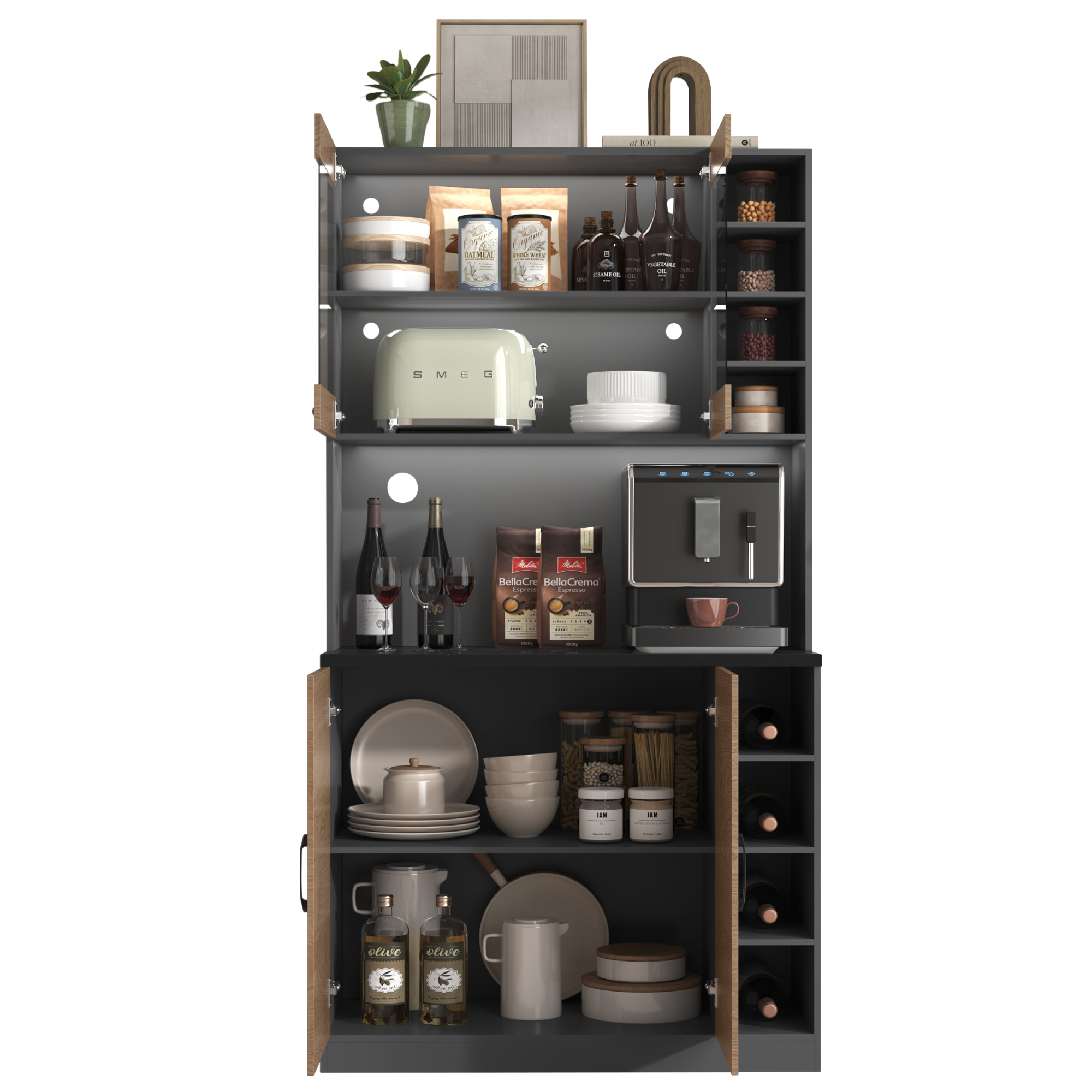 Kitchen Tall Cabinet, Pantry With LED Ambient Lighting, Wooden Kitchen Cupboard, Large Space For Microwave, Freestanding, Height-adjustable Side Storage Shelves