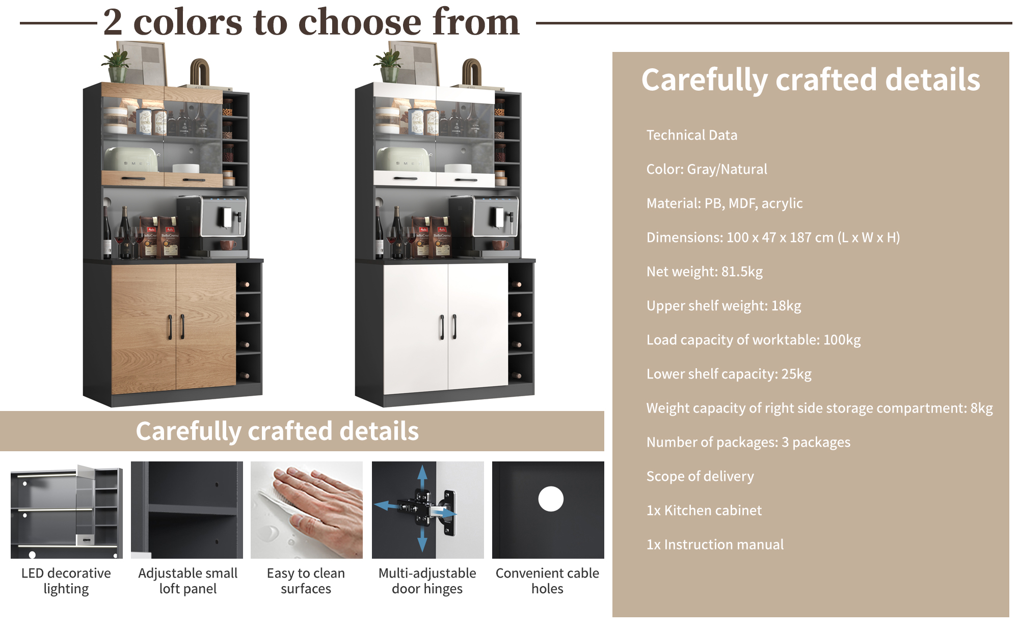 Product Name:100x47x187cm, kitchen tall cabinet, pantry with LED ambient lighting, wooden kitchen cupboard, large space for microwave, freestanding, height-adjustable side storage shelves